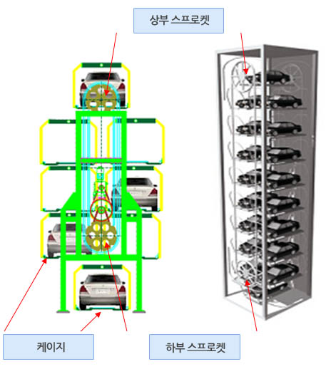 이 방식은 운반기를 상하로 회전 시키기 위해 주차장치 상하부에 대형 스프로켓을 설치하여 체인과 운반기가 원활히 수직 회전할 수 있도록 구성되어 있다