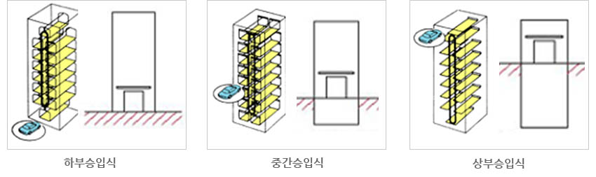 자동차를 입·출고 시키는 출입구의 위치에 따라 다음과 같이 3가지 방식이 있다.