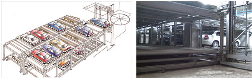 자동차를 주차하기 위한 공간인 운반기(파레트)를 평면상에 2열 또는그 이상으로 배열하여 평면상의 운반기를 횡행과 종횡을 단속적으로 한피치씩 또는 연속 순환 이동하여 자동차를 입·출고하도록 하는 방식이다.