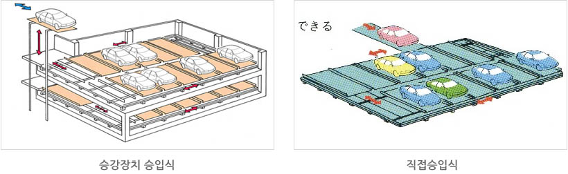 2) 직접승입식 : 별도의 승하강 장치가 없이 주차공간인 운반기에서 직접 차량을 입·출고 시키는 방식이다.