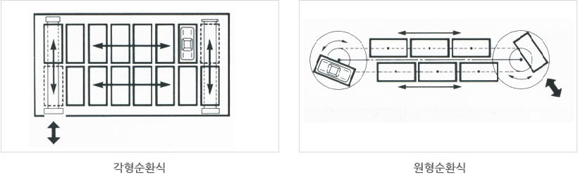 1) 각형순환식 : 주차장치의 양단부에서 운반기를 이동 시킬 때 횡행이동 과 종횡이동이 단속적으로 한 피치씩 구분되어 90˚각도로 직선운동