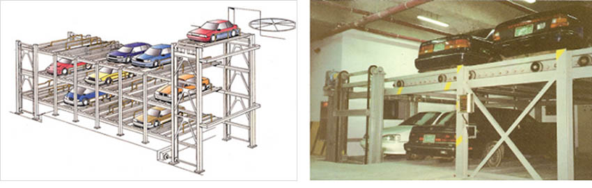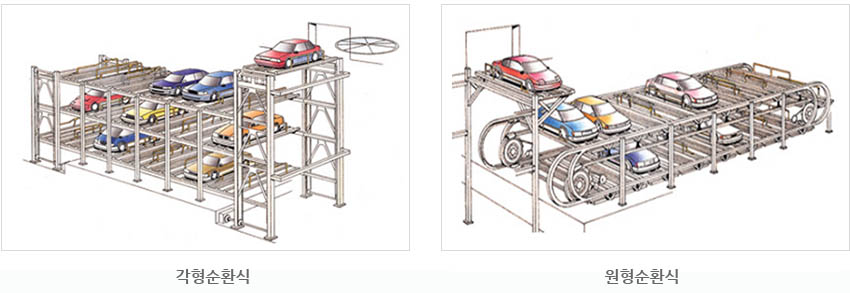자동차를 주차하기 위한 공간인 운반기(파레트)를 상하로 2층 또는 그 이상으로 배열하여 임의의 두층간의 운반기를 좌우 횡행과 주차기 양단에서 운반기를 승하강 이동시키는 동작을 단속적으로 한 피치씩 또는 연속 순환 이동하여자동차를 입·출고하도록 하는 방식이다.
