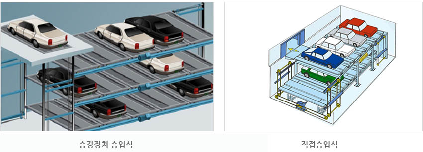 1) 승강장치 승입식 : 자동차를 입·출고시키기 위한 승하강 장치가 출입구와 주차시키는 구획층까지 승하강 하며서 자동차를 입·출고시키는