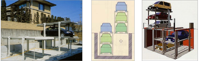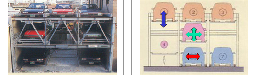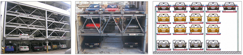(2) 승강횡행 피트식 자동차를 주차시키는 운반기 (파레트)가 상하에 다수로 구성되어 있다. 최상단의 운반기는 승하강 동작만 하고, 중간에 있는 운반기는 승하강 동작과 횡행 이동 동작을 하며, 바닥에 있는 운반기는 수평횡행 이동의 조합으로 자동차를 입·출 고시키는 방식이다. 최상단의 자동차를 입·출고 시키고자 할 경우 하단과 중단의 운반기를 수평 횡행 이동시켜 최상단의 운반기가 승하강 하는 데 걸림이 없도록 승강로를 형성하여 입·출 고가 이루어 지도록 구성되어 있다. |