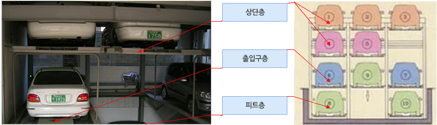 (3)승강횡행식 피트식 자동차의 입·출고 방식은 2단식 승강횡행식과 같으며, 하단 운반기(파레트)는 지하 피트부에 주차가 되도록 구성 되어 있는 주차기 이다. 다단식 승강횡행 피트식은 일반적으로 다음 사진과 같이 상단층, 출입 구층, 피트층의 단으로 많이 설치 된다 |