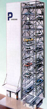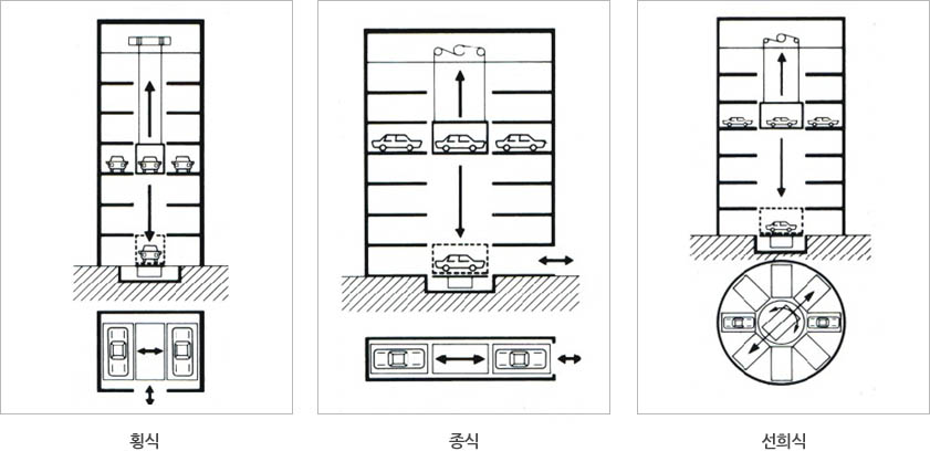 자동차를 주차시키는 주차구획이 여러층으로 배치되어 있고, 여러층의 주차구획 사이를 승하강 운행하는 승강기 로 구성되어 있다. 또한 승하강하는 승강기용 운반기(케이지 또는 리프트) 에는 주차구획의 자동차를 입·출고 하기 위한 수평이동 장치가 설치되어 있어 자동차를 좌우로 이송시켜 입·출고 하도록 하는 방식이다.